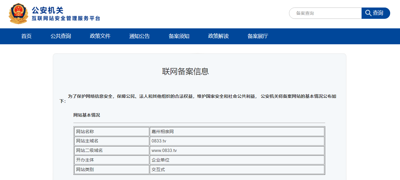 以下附图为:“嘉州相亲网 0833.tv ”公安机关联网备案信息 ↓